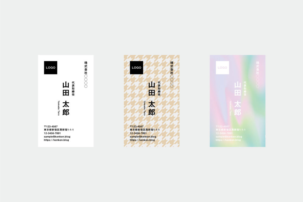 この3種類の名刺は、文字組み、フォントは全て同じで、背景と文字色だけを変えています。これだけでも、イメージはかなり違って見えると思います。